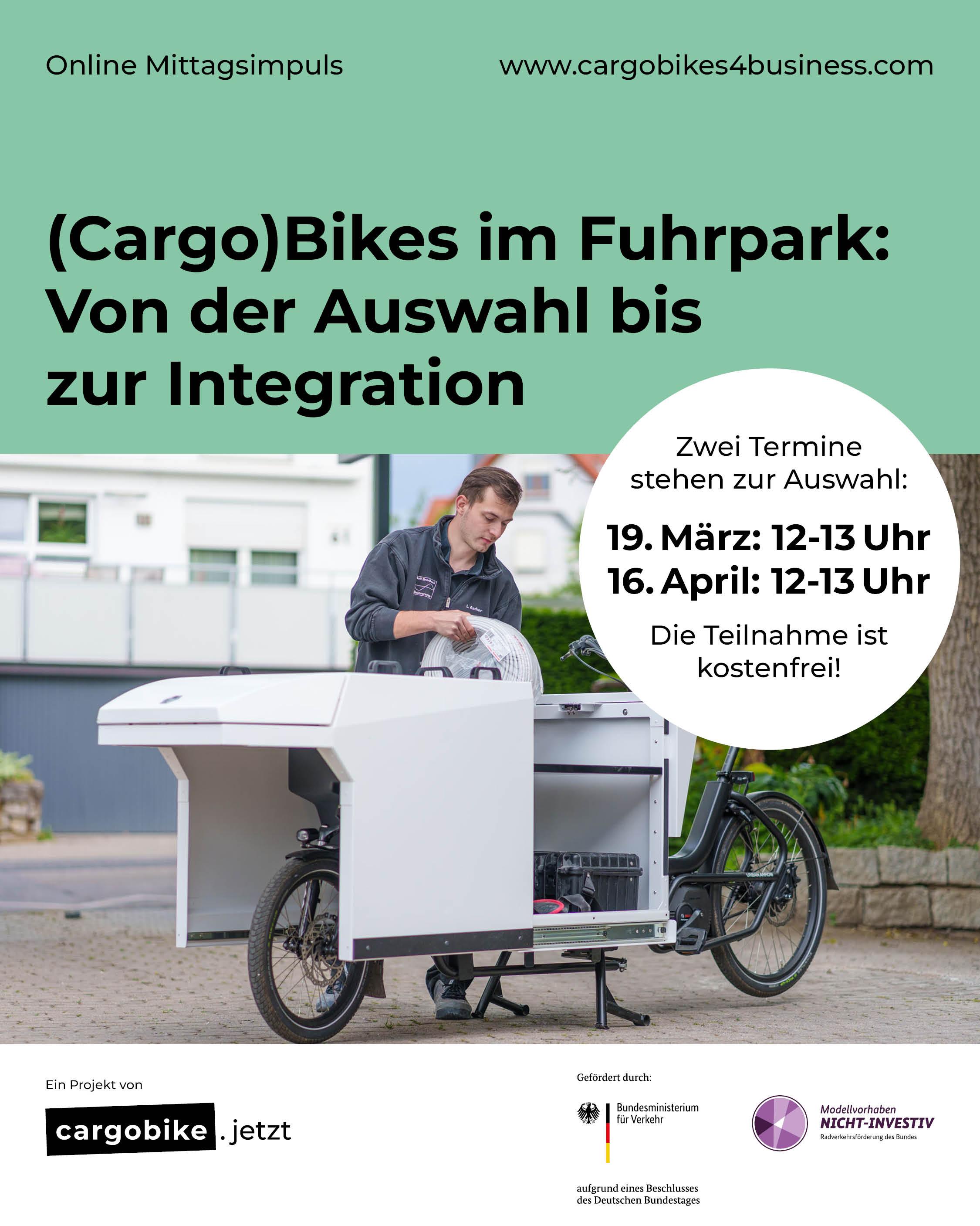Melden Sie sich zu einem unserer kostenlosen Mittagsimpulse zu (Cargo)Bikes im Fuhrpark an.