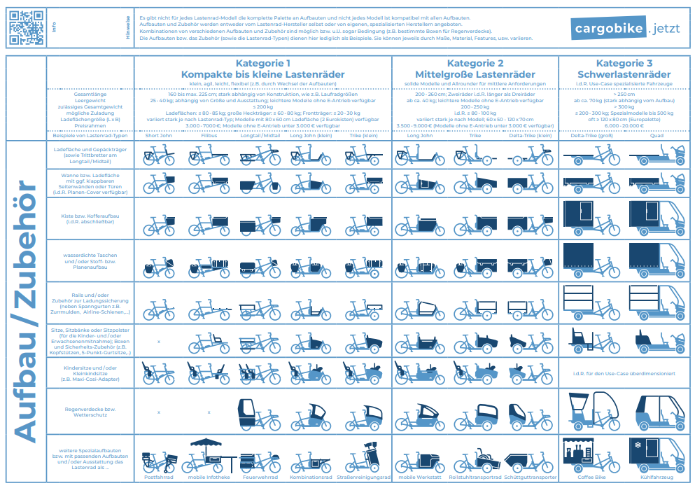 Im PDF finden Sie beispielhaft Aufbauten-Möglichkeiten der unterschiedlichen Lastenrad-Kategorien und den dazugehörigen Modellen.